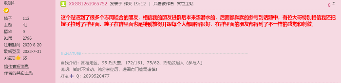 【浅谈淫妻群聊里面的那点事】 昨天突如起来的想法,组建了一个淫妻交友群聊,没想到引来了众多朋友的支持,我也随之把我的经验和过程分享给有需要的朋友,有很多朋友加我前会说他就是来潜水的,但是最后因为一些刺激的图片+视频,还是忍不住出来交流,总之很感谢进入我们群聊的朋友们,希望我们都以真诚待人,互相帮助。