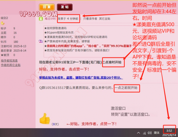 本帖最后由 人生淫佳 于 2025-8-14 03:23 编辑 打假!!!! 既然说一点前开始,但发贴时间却在3:44左右。时间差!!! 进Q群后全是引流文字,引流到一个APP下载。谁知道是不是有病毒的,安不安全。标准的一个骗子! 4602189